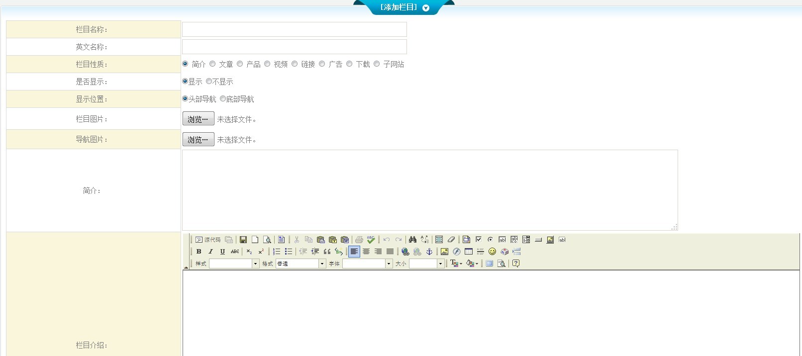 1、將您要添加的欄目名稱、英文名稱、欄目圖片、導(dǎo)航圖片、簡(jiǎn)介、欄目介紹等填寫完成。